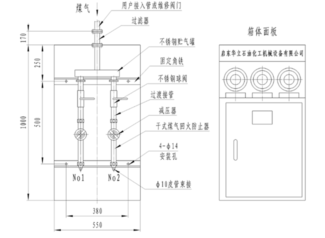 2、箱體正面板上安裝有進氣壓力表和出氣壓力表,直接監(jiān)控管道壓力和使用壓力。